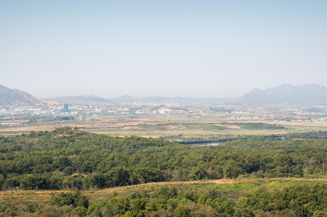 Jednou z největších atrakcí celého výletu je vyhlídka Dora (Dora observatory), která je jen kousek vzdálená od turistického centra, ovšem nachází se na blízkém kopci a je z ní tak dobrý výhled právě na hranice a i na území severní Koreje. Samozřejmostí byly i zde časté obchody se suvenýry, kde si můžete koupit DMZ trička, brýle MacArthura, mangetky či cukrovinky. U vyhlídky byly desítky turistů – samozřejmě nejčastěji bílí a anglicky mluvící. Všichni si fotili selfie, smáli se a my měli pocit, že jsme v Disneylandu. Neubránili jsme se pocitu, že jsme v nějaké Zoo a chodíme se koukat na zvířata v zajetí. Celý tento obraz ještě dokresloval budovatelský marš, který zněl z praskajících reproduktorů. Zaplatili jsme si půl dolaru za dalekohled a minutu jsme mohli zblízka zkoumat život na severokorejských polích (a kde jsme opravdu spatřili nějakého rolníka) a také vesnici jako celek – a vypadala hezky a zachovaně. Asi to ale byl jen propagandistický počin:-)