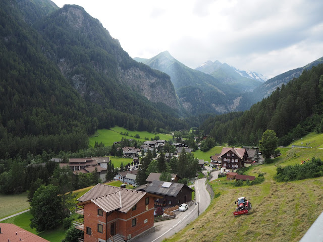 ... tohle jsem musela vyfotit. Políčko s traktorem, v pozadí Grossglockner už schovaný v mracích, domečky, kopce, lesy - prostě idylka, ale taky velká dřina ...