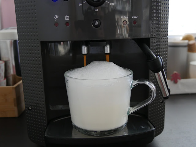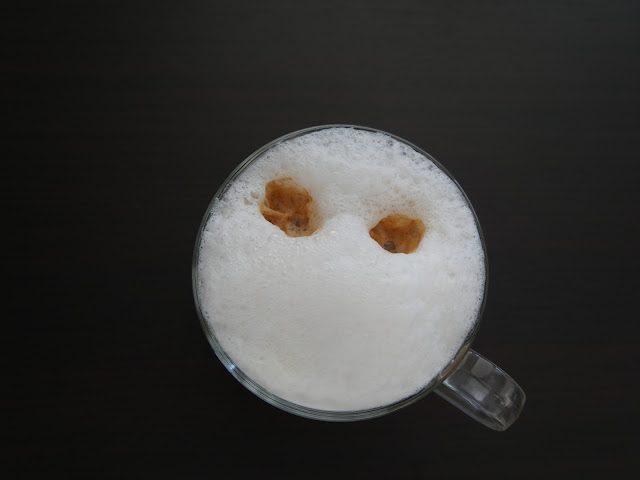 ... ne vždy se mi takto pěna povede. Někdy to funguje skvěle, čepice mléka je pevná, někdy se žádná neudělá. Nevím, jestli to je rukama, tryskou nebo přístupem s obavami jestli se to teď povede a tak se mi při jednom pokusu povedlo udělat kávu s výrazem ...