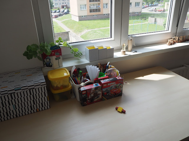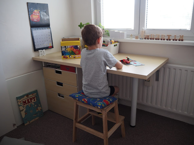 … normálně není využívaný, protože přes samé papírky není vidět deska stolu ;-). Ale, když se stůl tak hezky sám uklidil, hned si k němu Bertík sedl a skládal z Lega :-)) …