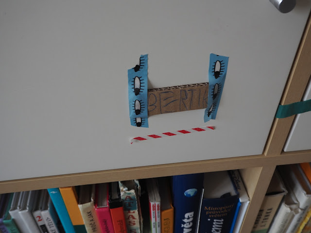 … Bertík si pokoj vylepšuje různými obrázky typu „zákaz vjezdu do postele“ a cedulkami se jménem (viz.první foto), což se mi moc líbí …