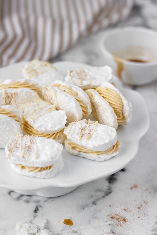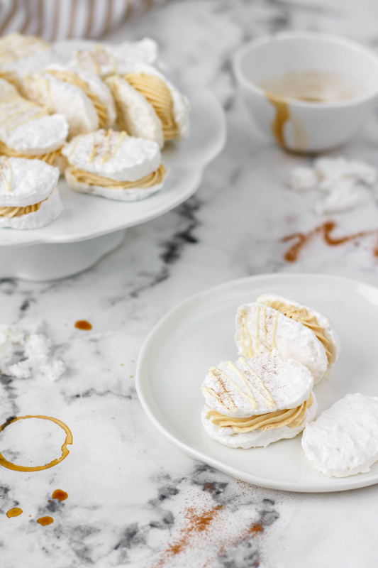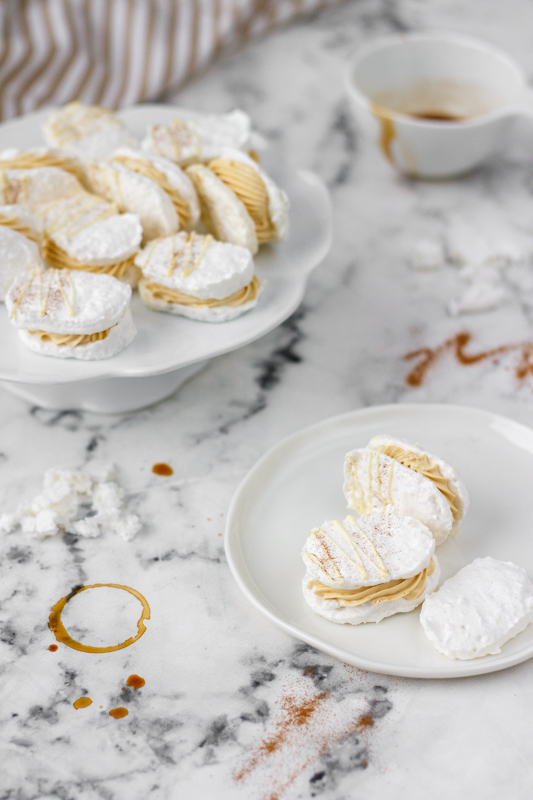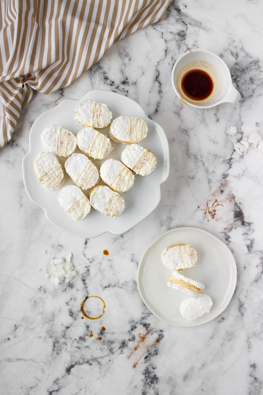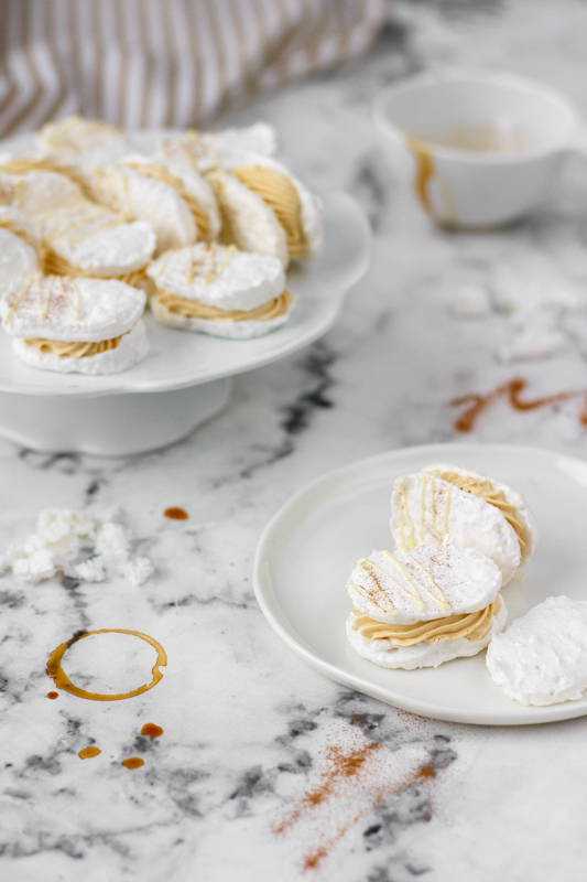 U toho postupu se přiznám, že jsem nezvolila ten nejjednodušší, mám dojem, že hmota na laskonky se dá šlehat i nad vodní lázní, mě se ale s cukrovým rozvarem pracuje dobře a na tu vodní lázeň třeba dojde příště. Stejně tak krém můžete zvolit klasický máslový, já jsem si vzpomněla, že na blogu mám dort s kávovým krémem, kam přijdou tři žloutky, a že je to tudíž i elegantní řešení, jak se zbavit zbylých žloutků z laskonek. Navíc ten krém je opravdu výborný.