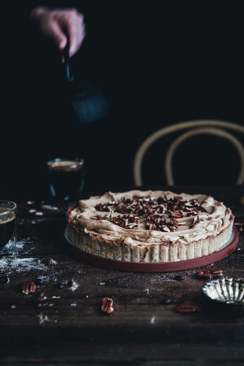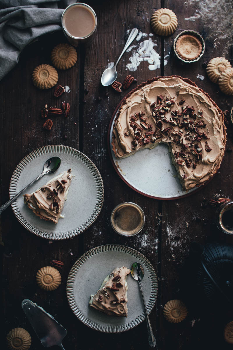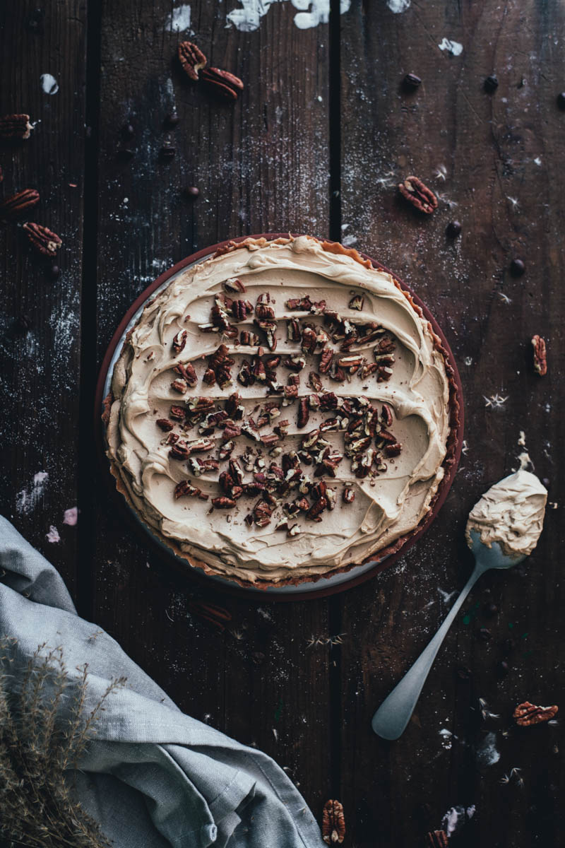 KOLÁČ S GANACHE Z BÍLÉ ČOKOLÁDY, KÁVOVÝM KRÉMEM A PEKANOVÝMI OŘECHY