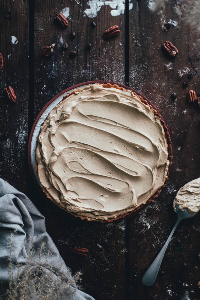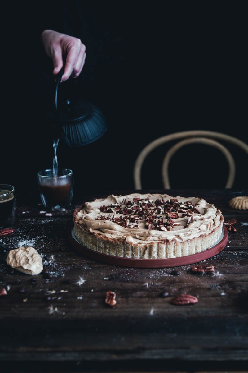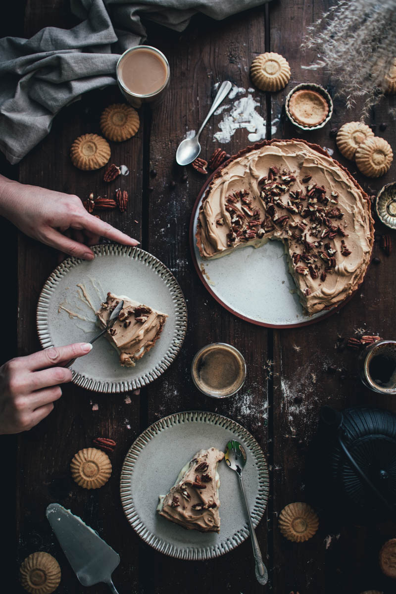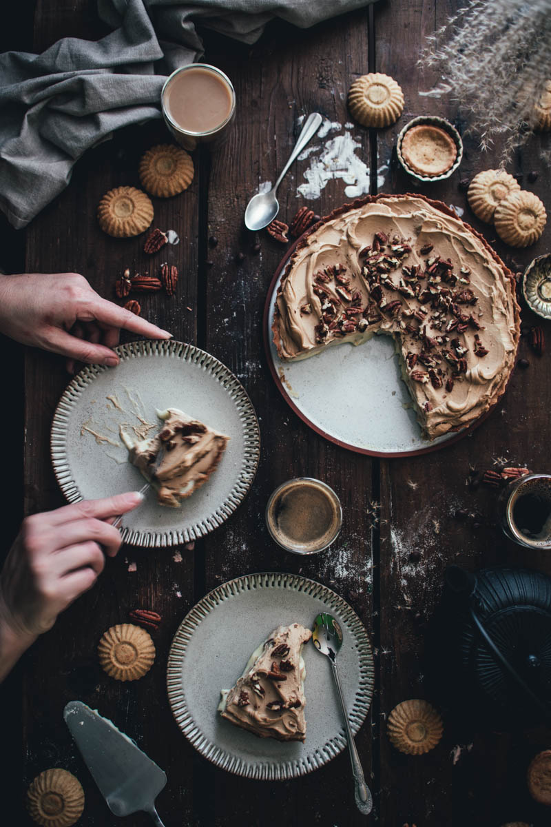 KOLÁČ S GANACHE Z BÍLÉ ČOKOLÁDY, KÁVOVÝM KRÉMEM A PEKANOVÝMI OŘECHY
