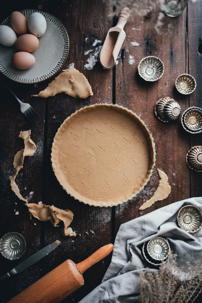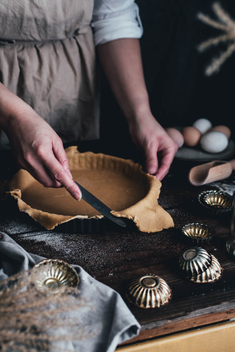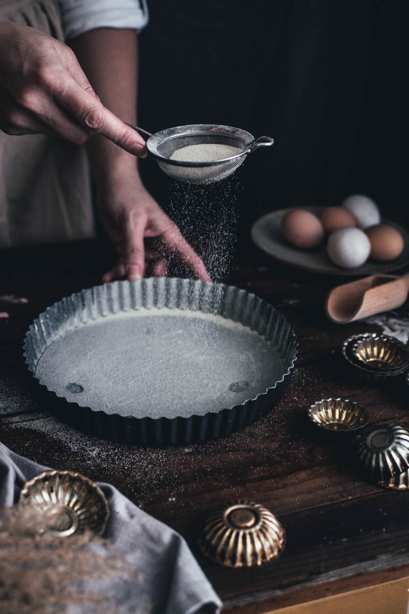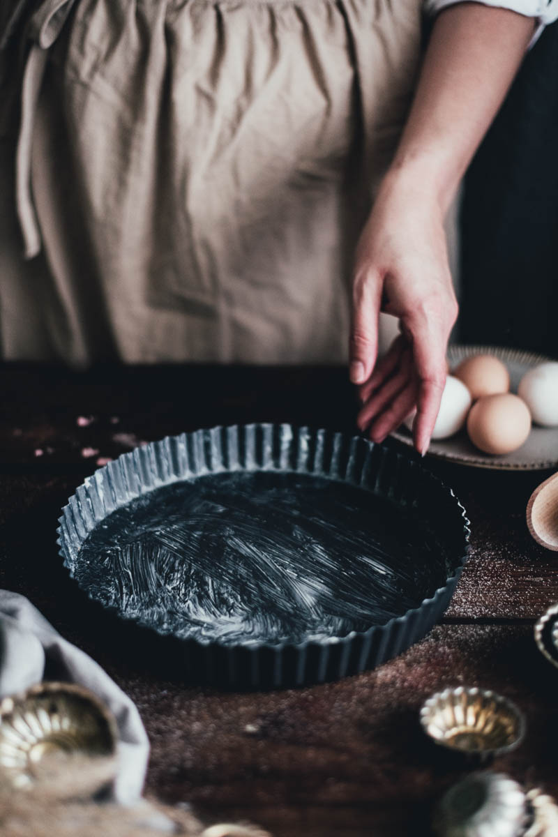 Poté vyndáme z lednice a vyválíme kulatou placku o síle cca 0,5 cm. Formu na koláč vymažeme máslem a vysypeme hrubou moukou. Pomocí válečku přendáme těsto do formy a přebývající okraje ořežeme pomocí nože.
