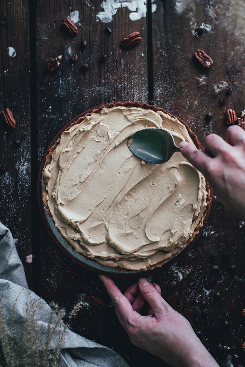 Odděláme z kastrolu a necháme trochu vychladnout. Jakmile směs trochu zhoustne, nalijeme ji do vychladlého korpusu s mandlovým máslem. Ganache necháme takto v pokojové teplotě vychladnout a poté dáme přes noc (nebo min. po dobu 12 hodin) vychladit do lednice. Doporučuji překrýt potravinovou fólii, aby se případně nevytvořil škraloup.