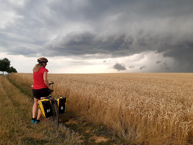 Asi dlouho nezapomenu na kličkování mezi bouřkovými mraky uprostřed polí, kdy moje meteo vzdělání bylo totálně zatemněno mou panickou hrůzou z bouřky. Jo, měl Karel pravdu, že šla kousek bokem. A ne, opravdu jsme neměli o 180 stupňů změnit směr a uhánět kamsi, kde překvapivě nebyla vesnice, ale neprostupný úvoz s křovím a kolejemi. Takže otočit a zpátky do černého bouřkového mraku (na který jsem potom v práci napsala několik posudků na velmi silný vítr, intenzivní srážky a krupobití). Naštěstí nás opravdu líznul jen svým okrajem.