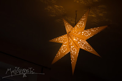 | … a s improvizovaným osvětlením. V celém bytě nám trčí ze stropu žárovky, a tak jsem to dočasně vylepšila svátečním osvětlením v podobě papírového lampionu – hvězdy – z Ikea |