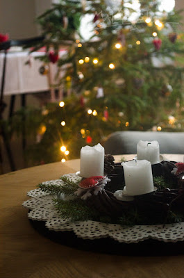 | Jediná doba v roce, kdy máme na stole ubrus. Tento mi ušila mamka z látky, kterou dostala jako svatební dar. Mělo to být původně povlečení, ale nakonec zdobí naši jídelnu |