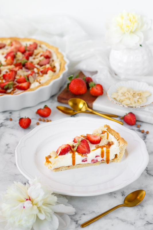 Křehké těsto, které se rozplývá na jazyku, nepečená krémová náplň s kousky voňavých a sladkých jahod, k tomu karamel a křupavé mandlové plátky, co ještě dodat? Snad jen, že takovýto dezert přijde vhod i ve velkých letních parnech, korpus se peče jen 20 minut a po vychlazení v lednici je tak celý moučník příjemně osvěžující. Pekla jsem ho už kdysi dávno (možná tak osm let zpátky) podle receptu v časopise Apetit, ale recept kdesi zmizel a já si pamatovala jen tu skvělou kombinaci křehkého korpusu, jahod a šlehaného krému a taky že tam byl karamel. Letos jsem ho proto zkusila upéct podle vzpomínek a svých chutí a je i tak perfektní.