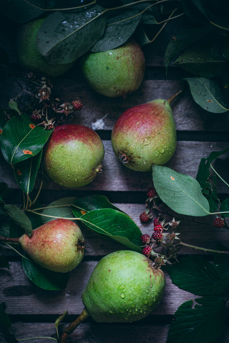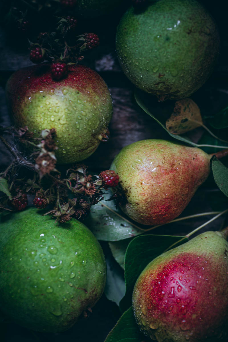 Hrušky umyjeme, rozkrojíme na poloviny, vykrojíme jádřinec a podélně je nakrájíme na pásky. Ostružiny omyjeme.