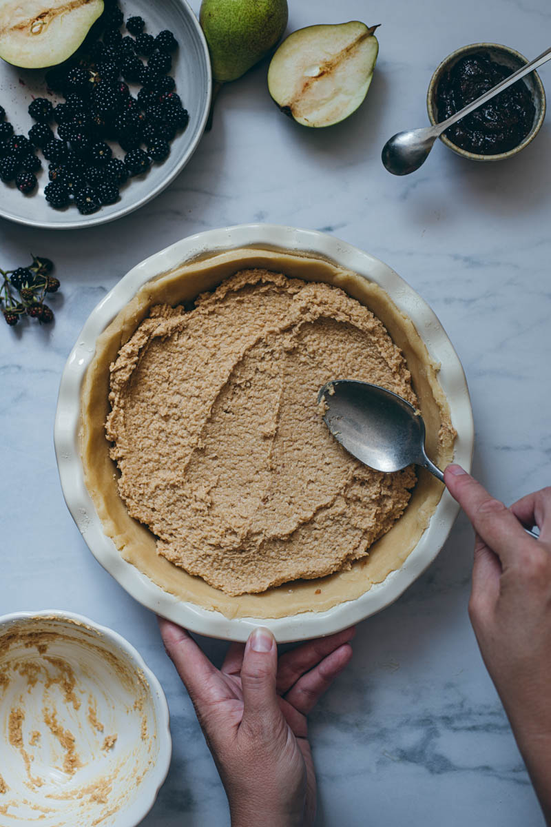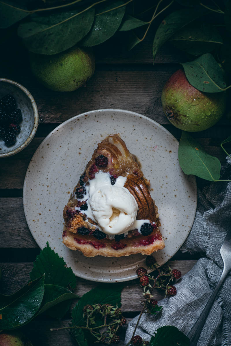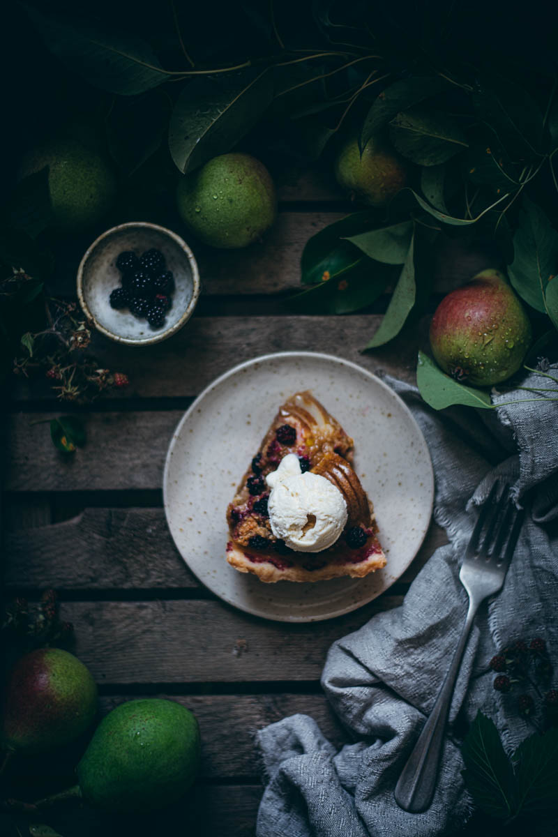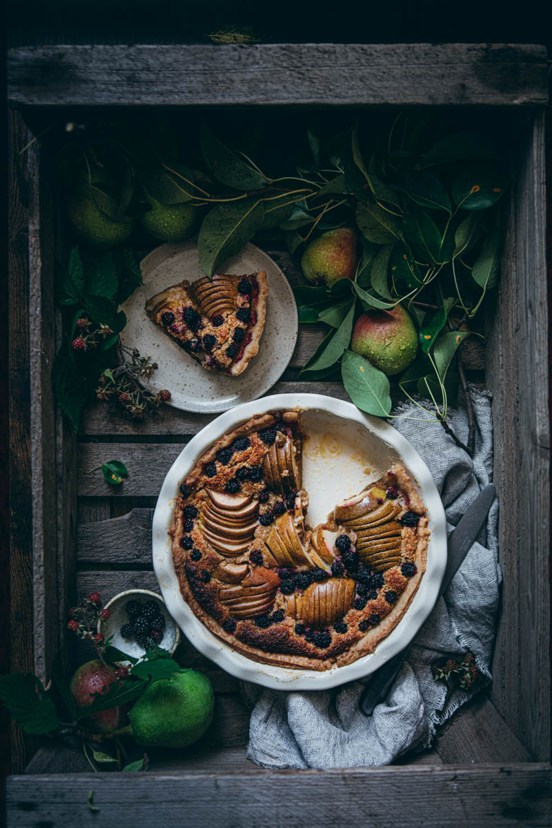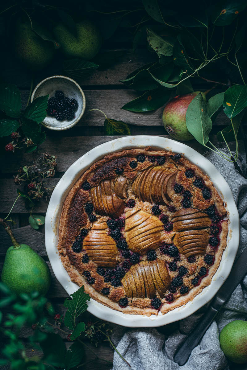 O víkendu jsme už otrhali první hrušky a ty bohužel pro uskladnění nejsou zrovna ideální. Proto tu mám další inspiraci na ovocný koláč. Křehké těsto, mandlová náplň, hrušky a ostružiny jsou ideální podzimní sladkostí k horké kávě nebo čaji.