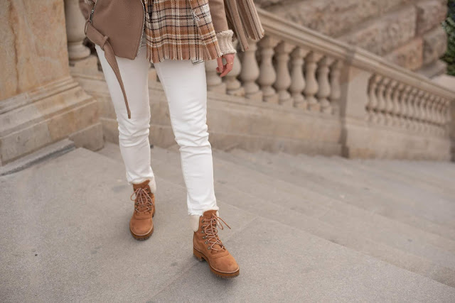HM biker jacket and turtleneck, Massimo Dutti jeans, Acne Studios scarf, Topshop hat, Timberland boots