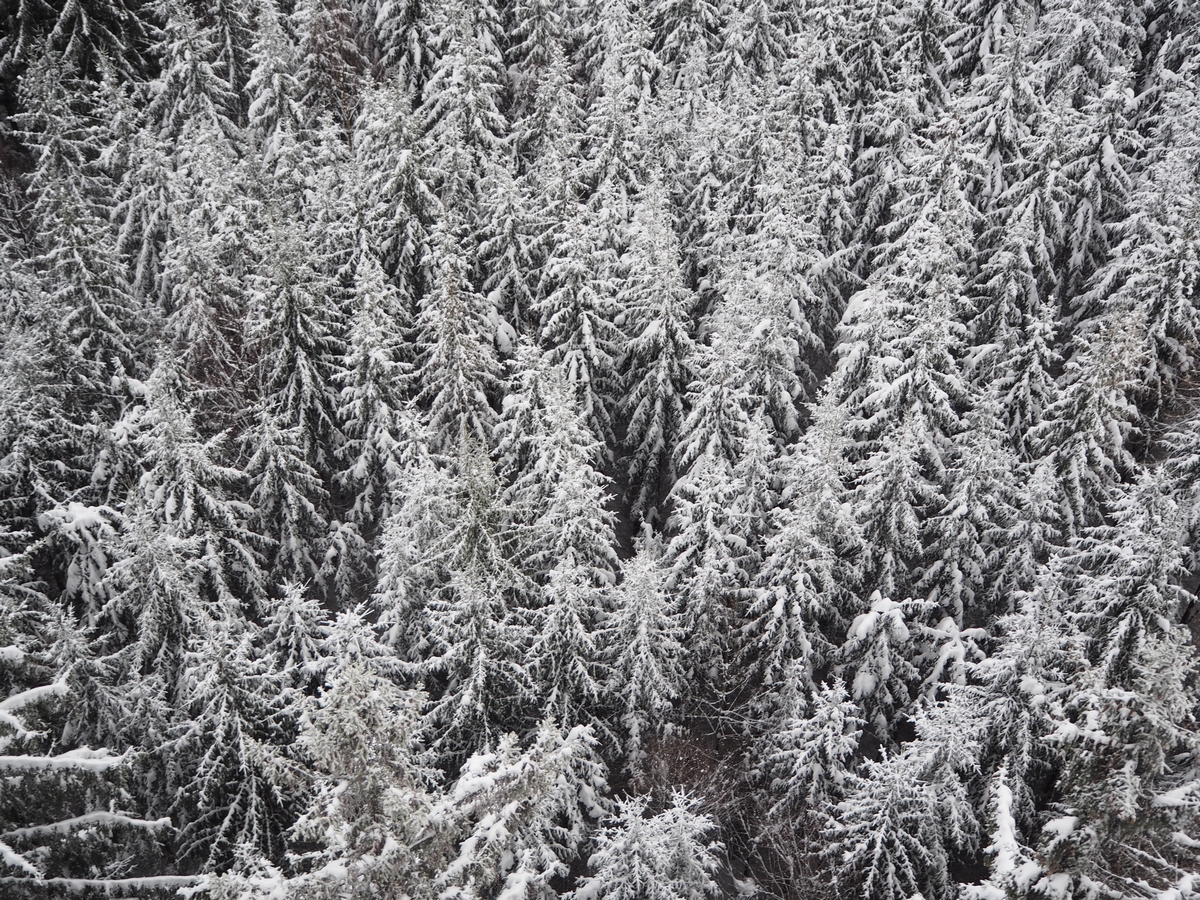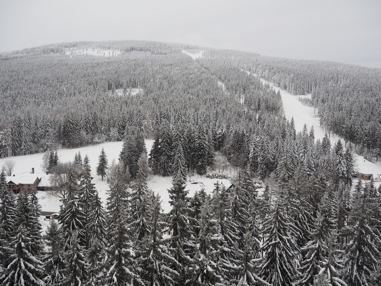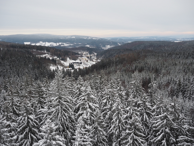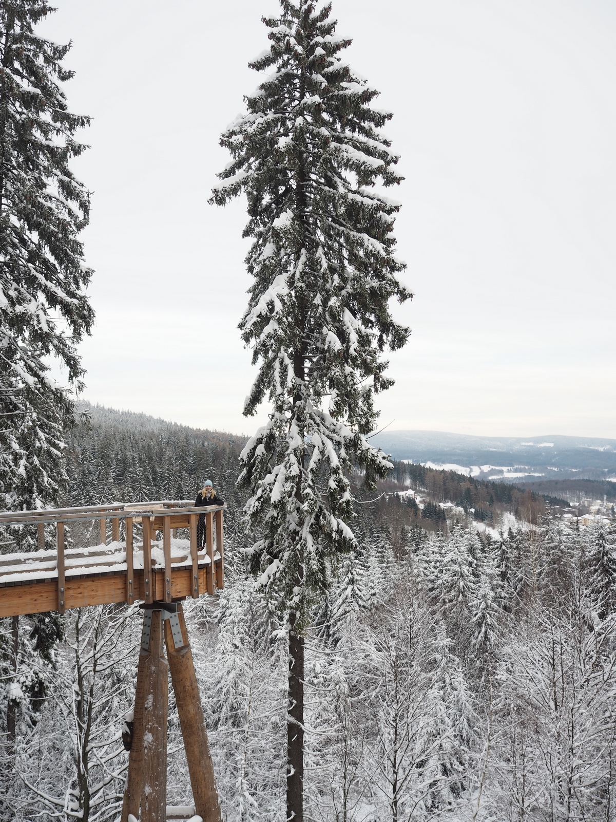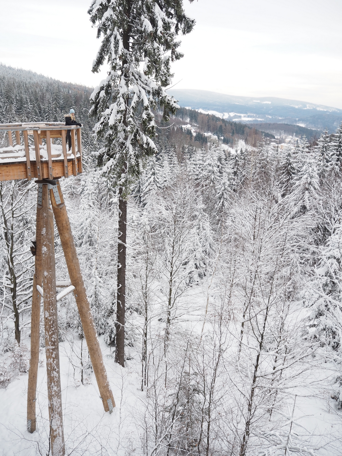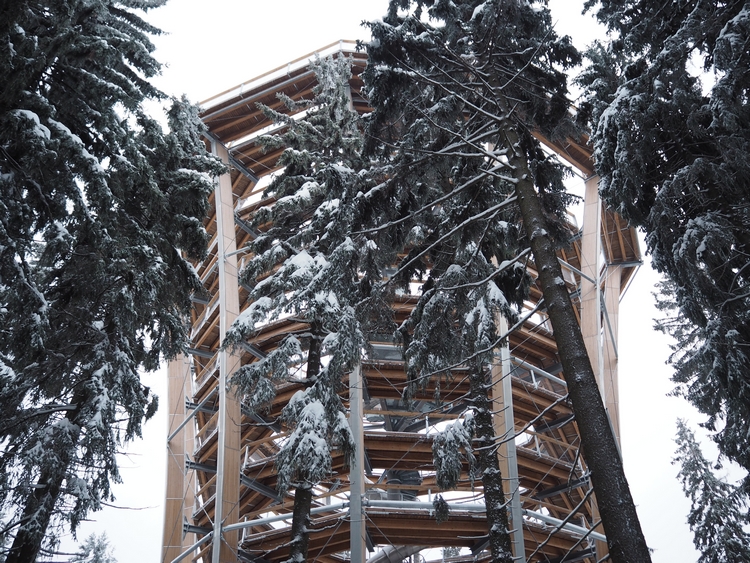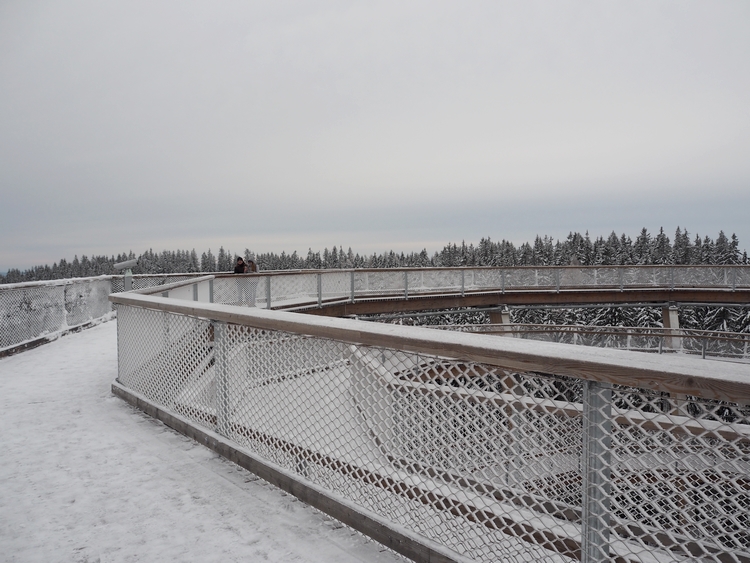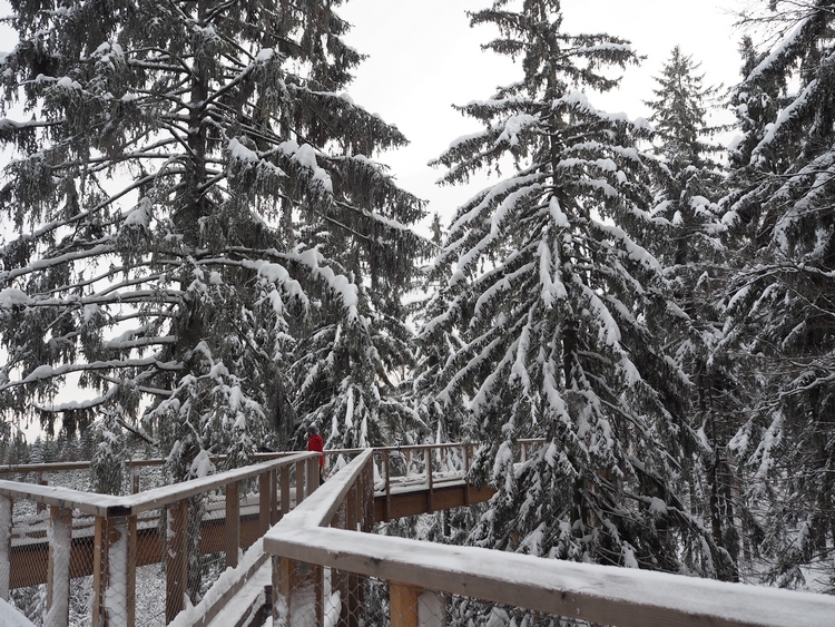 Vodorovná část stezky začíná ve 24 metrech nad zemí a procházíte se přímo v korunách stromů. Neříkám, že v létě by to nebylo taky krásný, ale ty zasněžené jehličnany zkrátka neměly chybu. Bylo to doslova pohádkový. Všude ticho, klid a jen vy a ty stromy. Postupně vyjdete až do 45 metrů. A tam je zase nepřekonatelný výhled na okolí.