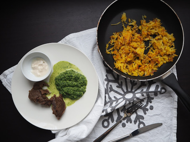 ... měli jsme hlad, chtěli jsme se ohřát a najednou jsme se ocitli v jedné restauraci. Byla plná hostů nebo rezervací. Myslím, že bylo něco po třetí hodině a číšník nás na jednu rezervaci posadil - byla na později a my jsme slíbili, že se jenom najíme a půjdeme. Nikdo nás ale nehonil, měli jsme spoustu času si jídlo vychutnat. Ani jeden jsme netušili kam jsme to vlezli. Přesnější informace jsem zjišťovala až později doma. Zašli jsme si na vyhlášený vídeňský Tafelspitz. Na stůl jsme dostali to, co je na této fotografii ↓↓ ...