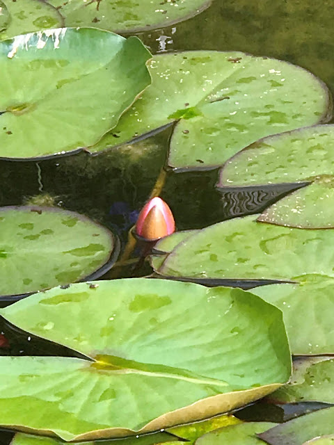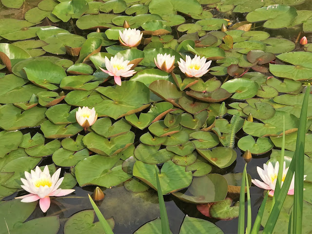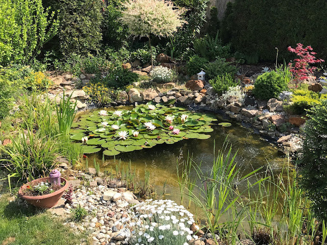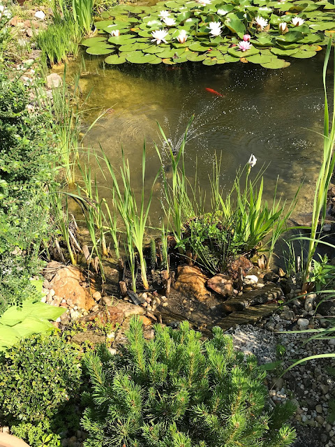 Lekníny vykvetly jak bílé tak růžové, a pokud se do nich opírá slunce, tak se mohutné květy krásně rozvinou. Pod nimi si zase ve stínu lebedí dvě ryby. Po ztrátách zimy 2016/2017 jsem další ryby nezakoupila. Prostě v jezírku zůstali dva jeseni zlatí a daří se jim dobře. Jako by se přestali stydět. Brázdí jezírko křížem krážem a jejich červené ploutve jsou neustále vidět jako praporky.