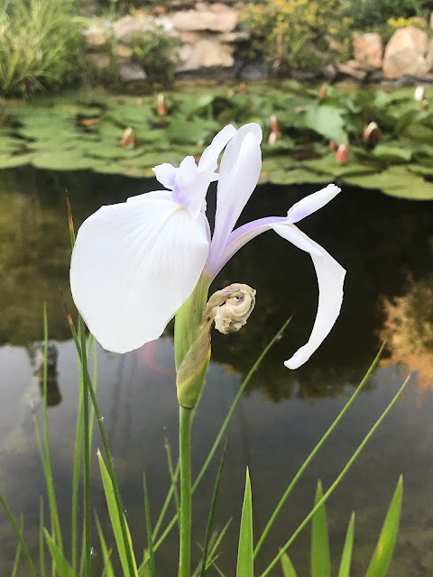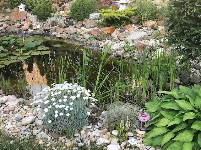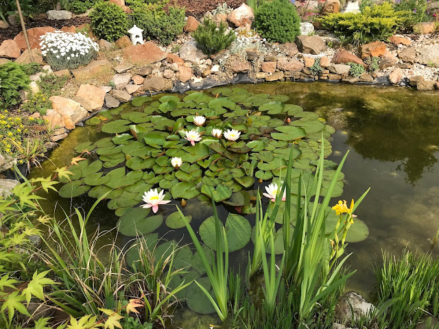 V květnu také kvetou kolem jezírka skalničky, kosatce a bílé nízké hvozdíky, které vytvořily pěkné polštáře.