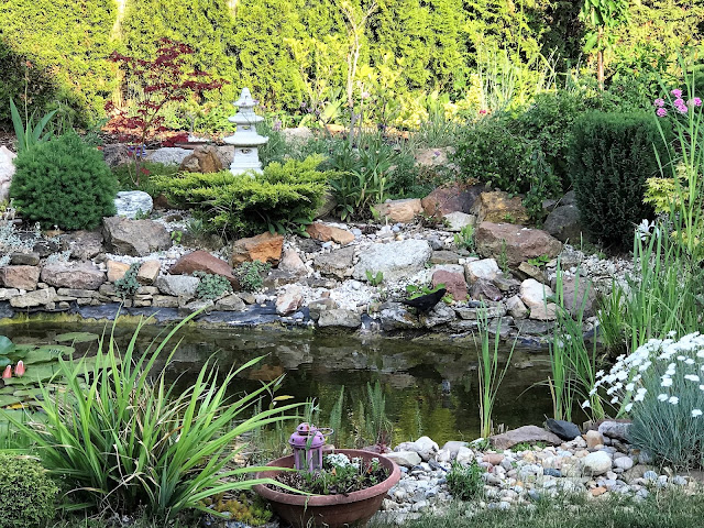 Možná, že vodu z jezírka chodí pít i další druhy ptactva, v každém případě se mezi kameny objevila ještěrka a myslím, že jsem zde spatřila ježka a sousedovic venkovní kočky, jak si smáčejí čumáček a pijí a hltají vodu. Bohužel se také částečně vydroluje jeden z břehů, na který navazuje skalka, takže jej budu muset o prázdninách rozebrat, doplnit vhodnými kameny a zpevnit.