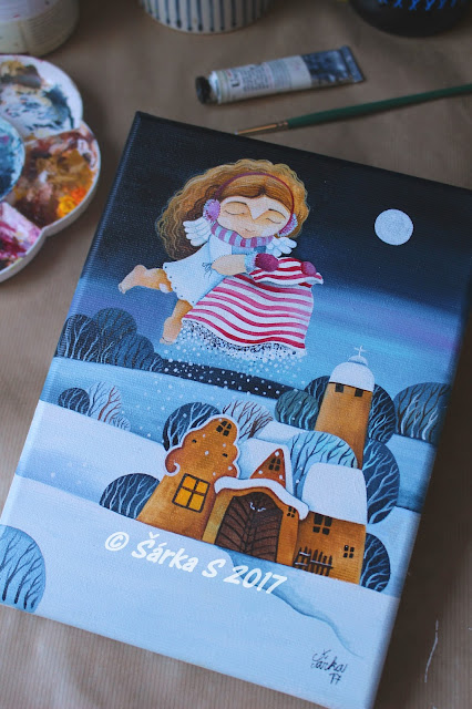 … motiv letícího andílka sypajícího sníh, to není všeobecně žádná novinka, ale je to novinka u mě… za ty léta a nespočet namalovaných andílků je tenhle první svého druhu ;)…