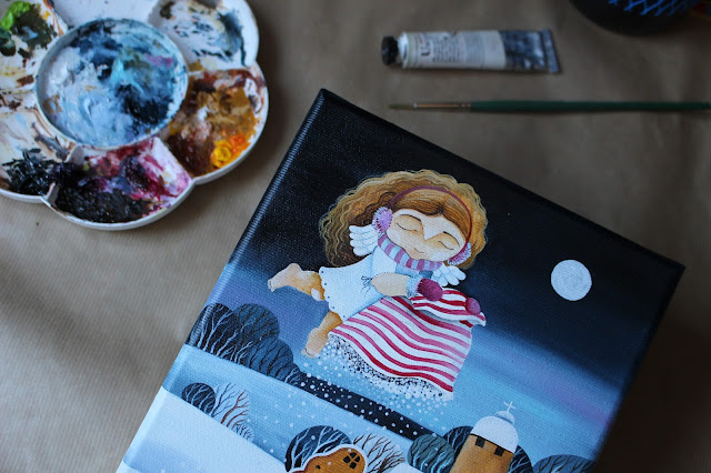 … motiv letícího andílka sypajícího sníh, to není všeobecně žádná novinka, ale je to novinka u mě… za ty léta a nespočet namalovaných andílků je tenhle první svého druhu ;)…