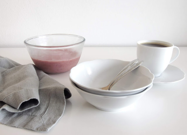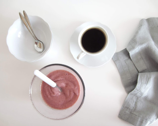 ...mně se bohužel mixér rozbil a s pořízením nového zatím otálím. Ale babička objevila ve svém mrazáku nemalou zásobu vaniček s rozmixovanými jahodami s cukrem, takže používám ty, na to mi stačí tyčák ;-). V tomto případě pak ani nemusím přidávat smetanu, jen rozmačkám banán, přidám zmrzlou jahodovou dřeň, rozmixuji a je to ;-)...