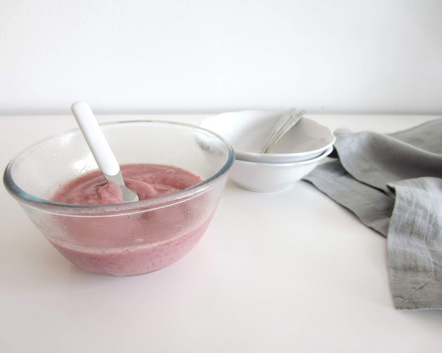 ...blíží se období sklizně jahod, tak postupně redukuji loňské zásoby v mrazáku. A na tuhle "rychlozmrzku" se u nás vždycky těšíme. Stačí na ni mít pár zmrzlých jahod v mrazáku, banán (ten nemusí být zmražený), cukr/med/sirup a smetanu, případně třeba sójové/kokosové mléko pro toho, kdo by chtěl mít zmrzku veganskou...