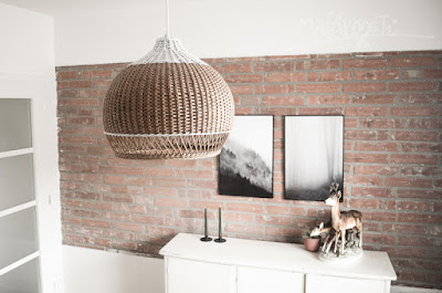 V ložnici jsem měla od začátku celkem jasnou představu, co by se mi k cihlové zdi líbilo. Chtěla jsem černé drátěné svítidlo s pěknou velkou žárovkou. Jenže zkuste to vysvětlovat doma, když naše kotelna ještě stále vypadá jako kůlnička na dříví a střecha by taky nutně potřebovala vyspravit. A dyť to přece svítí, tak co jako?! Nakonec jsem tedy sáhla po jiném řešení. Naši měli roky na půdě košatinu. Ze svého prvního bytu. V osmdesátkách jim zdobila právě ložnici. Pak už se nějak nehodila. Až nedávno ji objevila ségra. Chtěla ji dát k sobě domů nad postel (a uznávám, že k jejímu venkovskému stylu by byla docela přesná), ale nakonec se zamilovala do bílého Norma a byla to jasná volba. Až se nakonec stalo, že jsem se rozhodla dát tomu vyplétanému stínidlu šanci sama. Bylo ale prostě moc osmdesátkové. A tak jsem chvíli dumala a pak na něj naběhla se štětcem a balakrylem (jako vždy!)