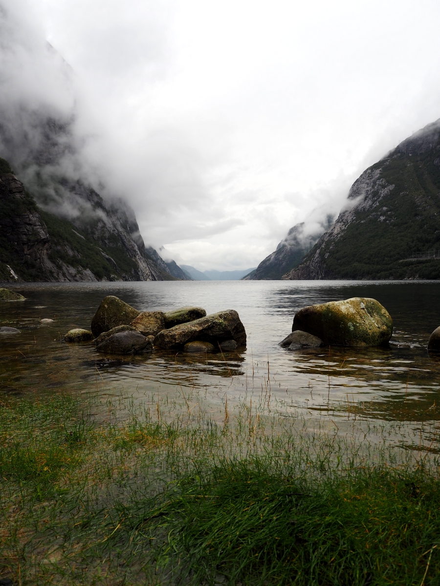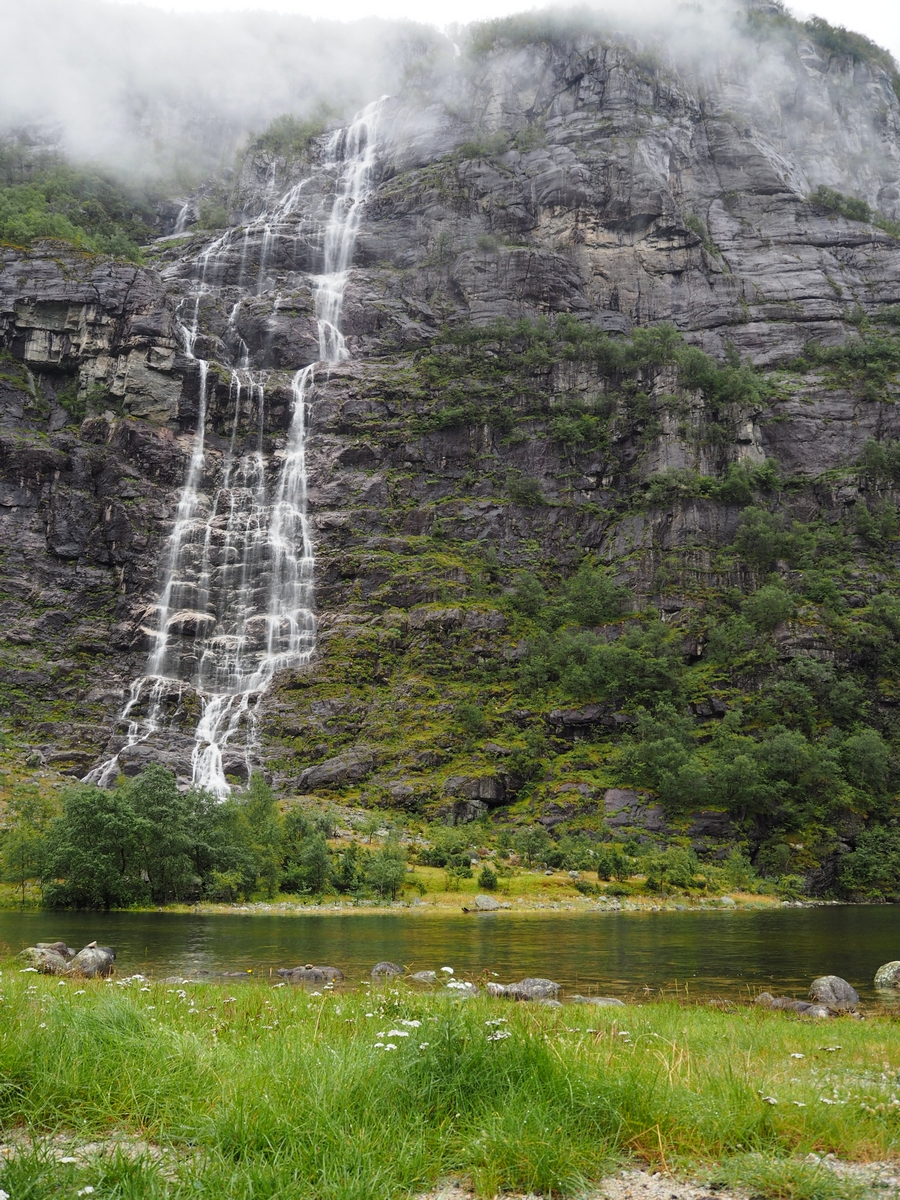 Lysebotn – tak, jak jsem ho poznala já, je tiché a hodně minimalistické místo na samém konci Lysefjordu. Je tu velká vodní elektrárna, pár domečků (opravdu jen pár), jeden kemp, pak docela dost dovolenkových srubů, které mají na zahradách bohatě rozkvetlé záhony a vymazlené grily s tím správným „hygge“ posezením. Dál jsou tu hodně břízy, zelenající se pastviny plné ovcí a beranů, vysokánské skalnaté hory z obou stran (ano, je to zde lehce klaustrofóbní), na které se plíživě lepí sněhově bílá mlha a po kterých tečou vodopády společně se spoustou malých „potůčků“ – když v Norsku zaprší, tak všechny vodopády mnohonásobně zesílí, místy se vytvoří úplně nové a všechny skály jsou tmavě žíhané, jak po nich stékají pramínky dešťové vody. A ještě je tu řeka vlévající se široce do fjordu. A to všechno najdete na jednom malém místě… Jako z nějakýho fantasy filmu.