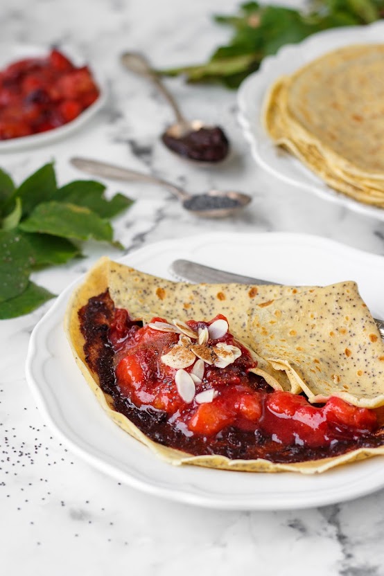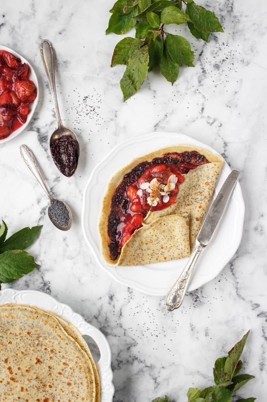 Doma nám o víkendu přistála sklenice s čerstvě uvařenými domácími povidly a protože nebyl čas na dlouhé experimenty, napadlo mě udělat trochu jiné palačinky. Do těsta jsem přidala mák a skořici a povidla doplnila o švestkový rozvar. Mňam!