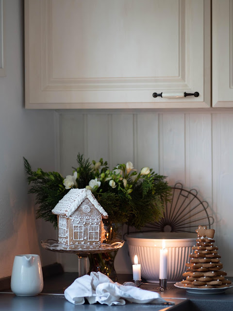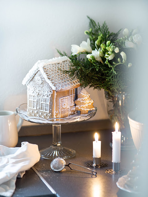 Na tento domček vám bude stačiť poleva z jedného bielka. Pred samotným spájaním som na domčeku nakreslila okná, dvere atď. a nechala dôklade preschnúť. Steny som spájala postupne po jednej a nechala dôkladne preschnúť. Polevu nanášam aj na spodnú stranu stien, aby domček na podnoste nelietal, ale pevne držal. Tú, ktorú pripájate si dôkladne podoprite napr. pohárom. To isté platí pre strechu. Vopred si pripravte (napr. pohár) v takej výške, aby vám ju podoprel. Pokiaľ vám aj vzniknú medzery, tie po zaschnutí pekne vyplníte a zakryjete. Ja na záver domček precukrujem práškovým cukrom, aby bol pekne "zasnežený".
