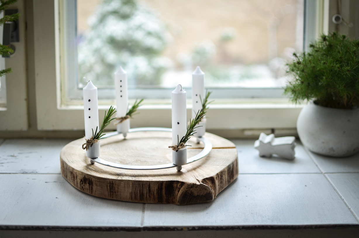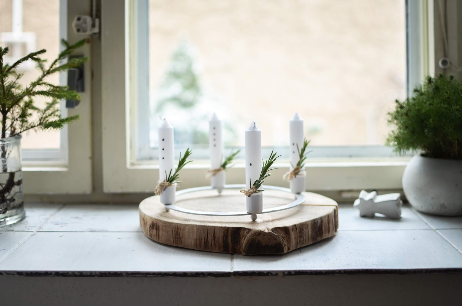 Původně jsem svícen celý omotala rozmarýnem, ale pak vůbec nevynikla jeho přirozená krása. Já nejsem na velké vánoční zdobení, někdy je i méně více, proto jsem z provázku, který vám přijde se svíčkami, udělala mašličky a přivázala větvičky rozmarýnu ke svíčkám. Na svíčky černou fixou udělala puntíky, protože advent 🙂 Hotovo. Včerejší sněžení spolu se svícnem mi navodilo moc krásnou předadventní pohodu, kterou vám fotkami posílám.