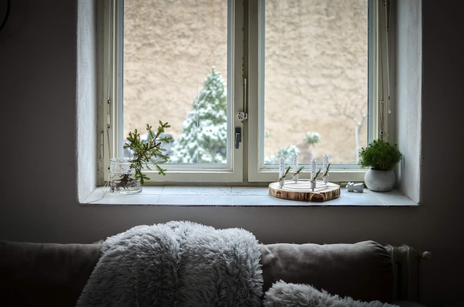 Původně jsem svícen celý omotala rozmarýnem, ale pak vůbec nevynikla jeho přirozená krása. Já nejsem na velké vánoční zdobení, někdy je i méně více, proto jsem z provázku, který vám přijde se svíčkami, udělala mašličky a přivázala větvičky rozmarýnu ke svíčkám. Na svíčky černou fixou udělala puntíky, protože advent 🙂 Hotovo. Včerejší sněžení spolu se svícnem mi navodilo moc krásnou předadventní pohodu, kterou vám fotkami posílám.