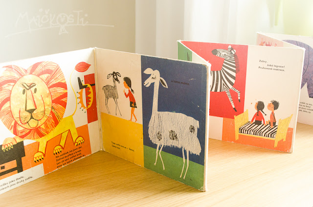 Leporelo s jednou dlouhou básničkou o tom, jak jedou děti na tábor a co všechno v lese zažívají. Uznávám, že takto dlouhý souvislý text je ještě na Madlu trošku moc, ale zatím aspoň prohlížíme hezké obrázky a povídáme si o nich. Časem se třeba básničku bude chtít naučit (i když v současnosti stále vede Hrubín!)