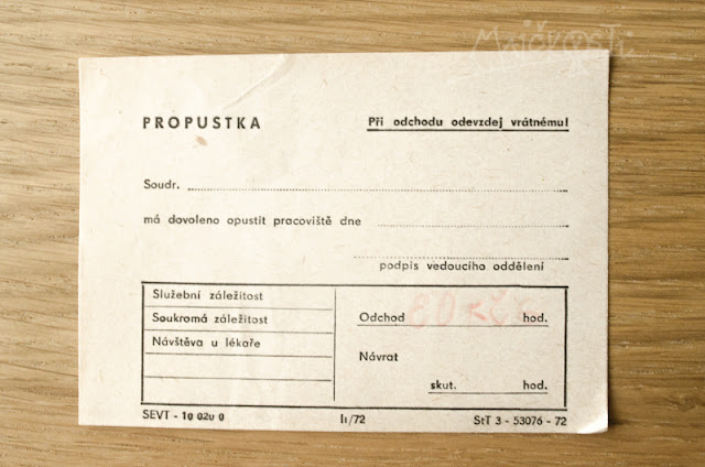 | Ve starých knížkách člověk objeví lecjaký poklad. Třeba propustku z práce, kterou si tu zapomněl jakýsi soudruh :-)… |