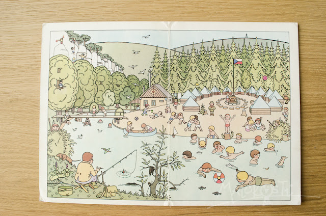 Tuhle útlou knížečku jsem pořídila v Ostravě v jednom zapadlém antikvariátu. Vlezla jsem tam jen tak na čumendu, jestli mě něco během pěti minut „necvrnkne do nosu“, což se sice nestalo, ale když se mi milá prodavačka začala velmi ochotně věnovat a pátrat po titulech pro nejmenší, kterých tam vlastně ani moc neměla, bylo mi líto se hned otočit na patě a odkráčet. Paní se velmi potila, protože i u patnáctého kousku jsem zakroutila hlavou. Moc textu, málo obrázků. Nakonec s posledním vypětím sil vyhrabala toto. A je to terno! Já ji miluju – je to můj favorit. A Madlenčin taky! Knížka nemá VŮBEC ŽÁDNÝ text – jen pět dvoustránkových obrázků a dva menší – vepředu a vzadu. Jsou na nich lidé – hodně lidí. V různých ročních obdobích a při různých aktivitách. Vyfotila jsem Vám mé nejmilejší stránky. Ty prázdninové! 🙂 Ilustrace od Jaromíra Zápala jistě znáte z populárního Neználka a nebo z mého staršího příspěvku (na konci článku TADY.
