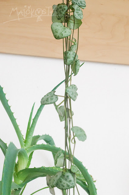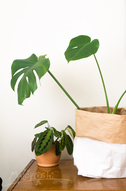 Největší radost mám ale z monstery. Toužila jsem po ní dlouho, předlouho. Jenže ona prostě NENÍ! Pro většinu lidí je monstera synonymem k socialistické kytce. Monstera = monstrum. Nejsou už ani ve školách. Kamarádky mamka je školnicí. Na dotaz dcery prý odpověděla druhým dotazem: myslíš to hnusné a obrovské??? Takže tak. Asi prostě monsteře bude muset reputaci spravit až naše generace. Ta starší už si k ní cestu nějak nemůže najít. Zřejmě na ni moc dlouho koukala na chodbách MNV, OPBH a podobných místech... za obří výpěstek z hobbymarketu se mi čtyřciferná částka opravdu dávat nechtěla, a tak jsem spoléhala na výměnné facebookové skupinky. Jenže! Abych mohla vyměňovat za monsteru, na to mi chyběla potřebná esa v rukávu. Nezbývalo, než čekat, až se moje džungle dostatečně rozroste... zhruba někdy v předvánočním čase moje sestřenice uveřejnila na svém Instagramu příspěvek o tom, kterak byla obrovskou kráskou čerstvě obdarována, a já se svěřila se svým marným bojem. No a v tu chvíli se, jak by řekl Paolo Coelho, celý vesmír spojil: hned druhý den jsem šla na návštěvu k naší prababi a tam v hale pod schodištěm obří monstera! Skoro se mi chce vynechat trapnou historku o tom, jak jsem svoji mámu donutila vytáhnout z kabelky kapesní nožík a potajmu jsme to tam pižlaly, načež jsme dorazily domů a já zjistila, že jeden list mi na zakořenění stačit asi nebude. Chyba začátečníka! A pak mi ruplo v zádech. Máma mě na druhý den objednala ke své kamarádce na masáž. Vstoupím do předsíně a hádejte co! Nedokázala jsem se ovládnout. A ta dobrá duše mi kus své rostliny ufikla, zabalila a já měla Vánoce předčasně! Bohužel jsem ve vodě zakořeňovala trochu dlouho, a tak mi jeden ze tří listů zežloutnul a umřel (rada pro ostatní začátečníky!), ale honem jsem zasadila, teď už vylezl list nový a já se raduju! :-) Na fotce vidíte novou členku naší rodiny v improvizovaném květináči vytvořeném z papírového pytle. Stál asi tak deset korun. Ne, že by zrovna přežil povodeň, ale pokud do něj postavíte květináč i s podmiskou a trochu se vám ulije, nic se neděje. Už jich mám takto po bytě několik a zatím drží. Je to asi nejlevnější obal na květináč v naší domácnosti! :-)