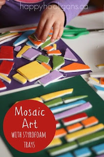 A pak mozaiky z nastříhaných polystyrenových (?) podložek pod masem vysterilizovaných v myčce a nabarvených akrylovými barvami. To bude i 3D a myslímže by to mohlo chytnout i Klárku, kterou už jen tak nějaké "dětské" vyrábění nebere.