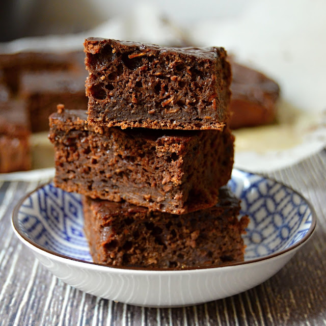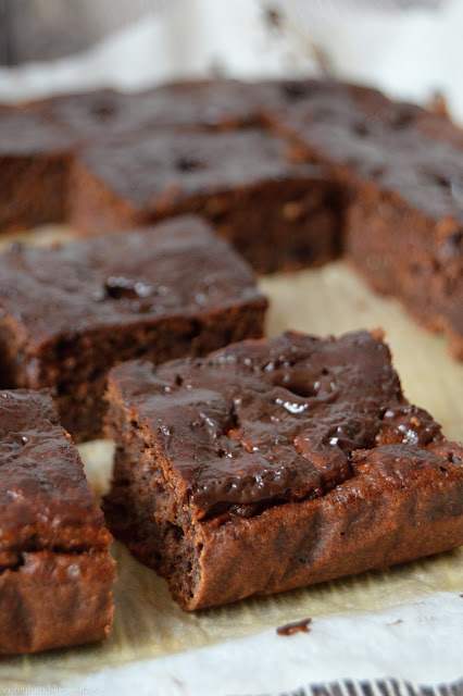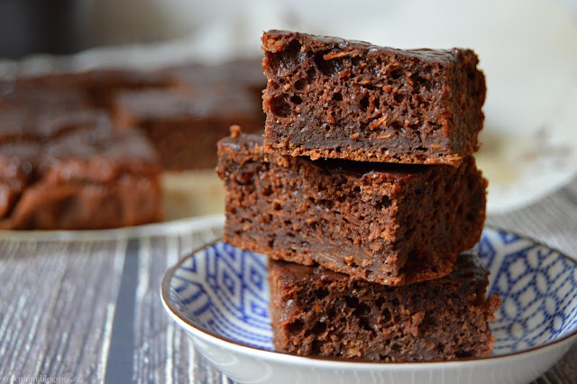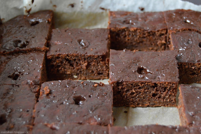 Vypracujeme těsto, které nalijeme na vysoký plech s pečicím papírem. Dáme péct při teplotě 180 °C přibližně po 35 minut.