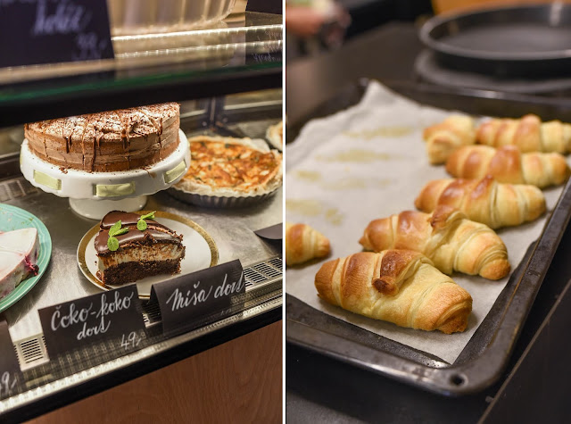 Za vytrínou si můžete objednat z denní nabídky dortů a dezertů třeba ke kafi, které tady fakt umí. Škoda, že na ně nezbylo během snídaně místo, musím to napravit příště. Ale domů jsem vzala té své polovičcce alespoň kousek punčového řezu (miluje ho), nejen, že vypadal fakt božsky, ale na to, že ho moc nemusím, tak byl fakt výborný. Takže tím víc mě mrzí, že jste z těhle dezertů neochutnala víc.