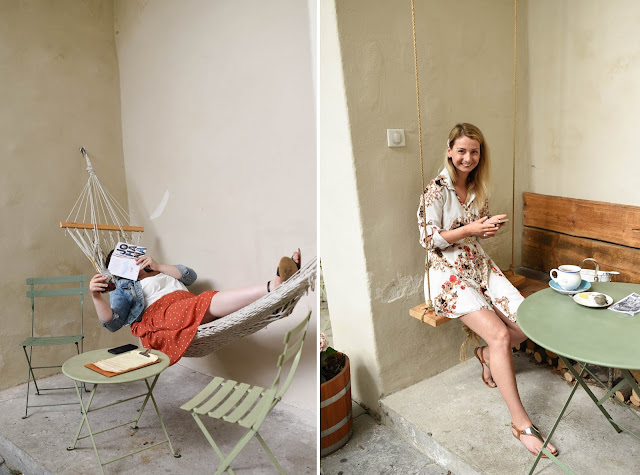 A protože bylo ten den krásně, usadily jsme se s holkama na venkovní zahrádce. Je tu hned několik stolů, dokonce houací síť a taky sezení na houpačce. Ráno je tam doslova božsky a snídat tu můžete celé dopoledne, nikdo vás nebude rušit a vyhánět.