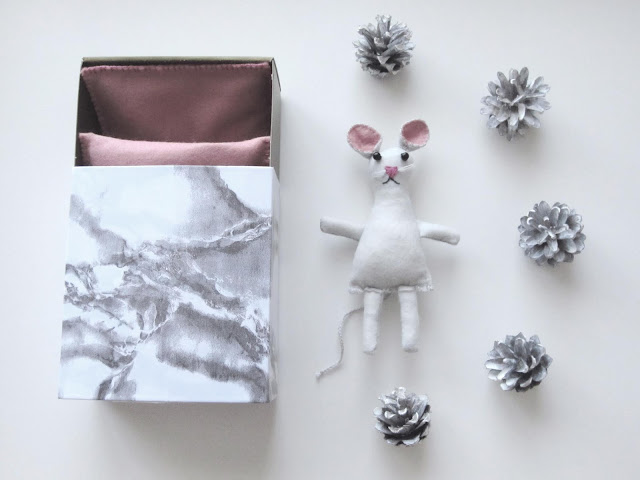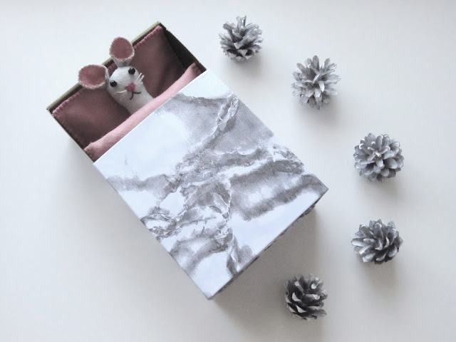 ...s materiálem nebyl problém, protože jsem si nedávno v euforii z tohoto článku u Máji nakoupila zásobu barevných filců a bavlnek. Na "postýlku" se mi ideálně šikla krabička od kosmetiky L'Occitane (bylo to nějaké dárkové balení, jež mi kdysi darovala jedna kamarádka). Vrchní část krabičky jsem polepila zbytkem mramorové fólie z Lidlu, ta se na nějakém mém tvoření objevila i dříve. Dovnitř stačilo vystřihnout prostěradlo, ušít polštářek s peřinkou a pelíšek byl hotový raz dva. Ani výroba myšky mi nepřipadala zas tak složitá, jen to moje provedení je prostě takové školácké, líp to nedovedu...
