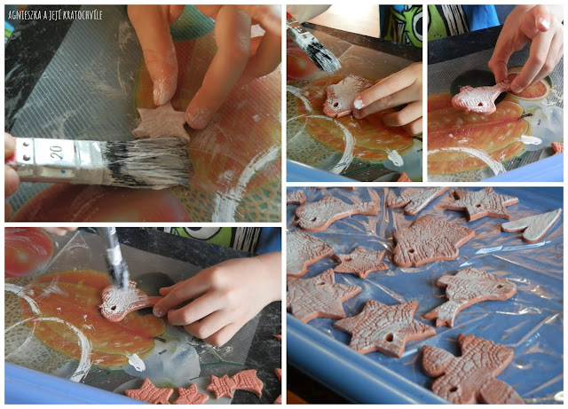 Po vyschnutí téměř nasucho přetřeme větším štětcem nebo potupujeme kouskem kuchyňské houbičky nebo kouskem hadříku jednotlivé výrobky bílou akrylovou barvou (používám balakryl nebo eternal, které mám doma vždycky po ruce :-)). A pak už zbývá pouze protáhnout nitku nebo provázek připravenými otvory a zavěsit.
