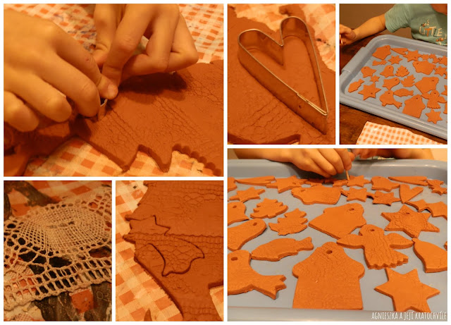 Pak jsme vzali do rukou formičky na cukroví a vykrajovali z plátu ozdoby. Pokud je budete chtít později zavěsit, nezapomeňte si udělat dírky. My používáme obyčejnou dřevěnou špejli, kterou vykroužíme velikost dírky podle potřeby.
