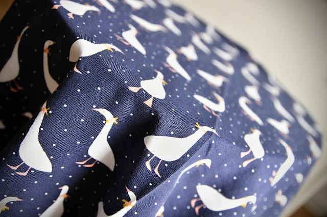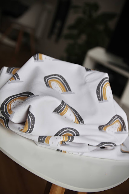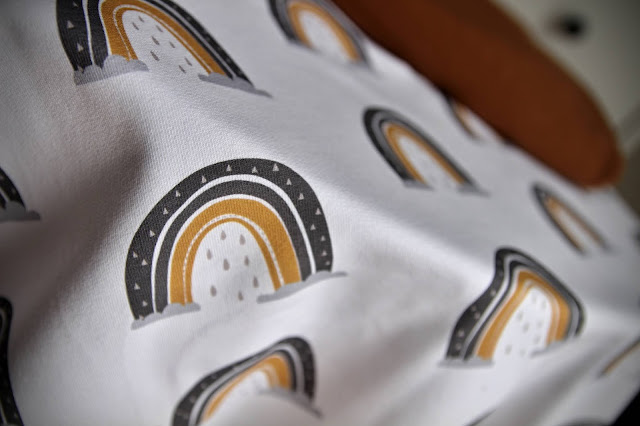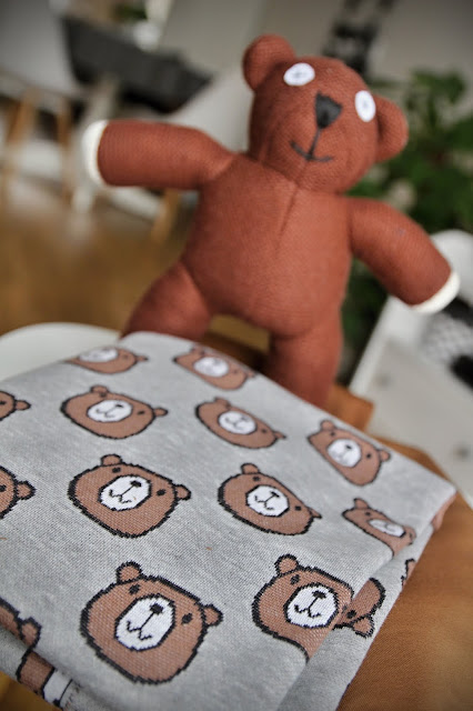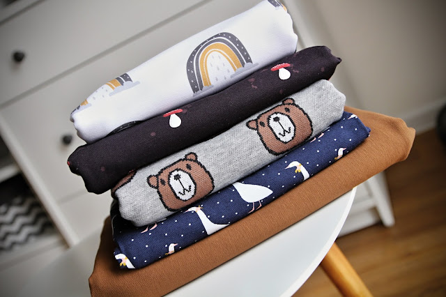 Medvědi, houbičky a duhy jsou pro Štěpu na trika, krásná hříbkově hnědá je na tepláčky a husičky jsem vzala Barunce na tričko.