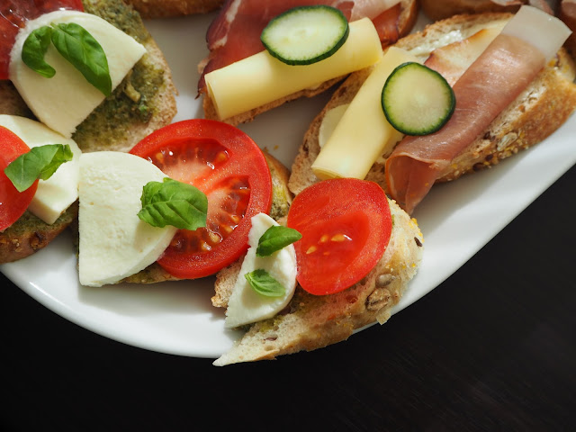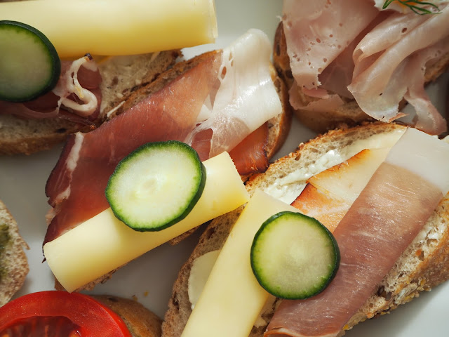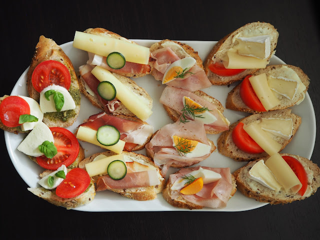 … máslo, gouda, hermelín a rajče. Vím, že je z fotek zřejmé co na chlebíčcích je, ale píšu si to pro sebe ;-). Z chlebíčků jsem měla radost, byly moc dobré. Chlebíčky jsem nikdy moc neměla ráda, protože nemám ráda pečivo z lednice. Přečetla jsem si ale, že je dobré je dát do chladu uležet, aby se chutě propojily. Udělala jsem to a opravdu jim to pomohlo …