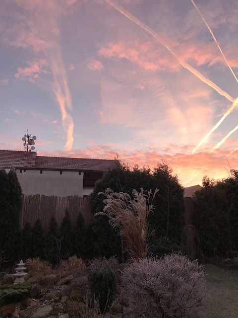do jižních Čech. Při pohledu z okna, brzy ráno, se ocitám v ojíněném království prozářené jemnými růžovými tóny, s nebem protkaným ještě nerozplynutými dráhami kondenzačních stop, které zde zanechaly dopravní letadla. Jako by je snad tvořila příroda sama…