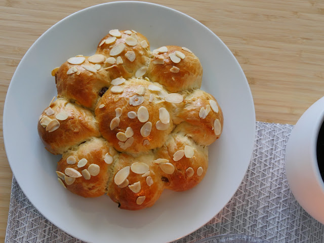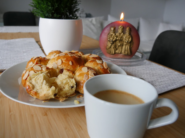 ... inspirovala jsem se na IG účtech, kde těchto "vánoček" bylo několik. Sice jsem našla správný recept, ale nakonec jsem zvolila náš osvědčený, ten na vánočku - tady. Těsto jsem rozdělila na osm menších a jeden větší díl a takto spojila. Co a jestli to něco znamená jsem zatím nezjistila. Líbil se mi tvar a taky jsme měli chuť na vánočku ...