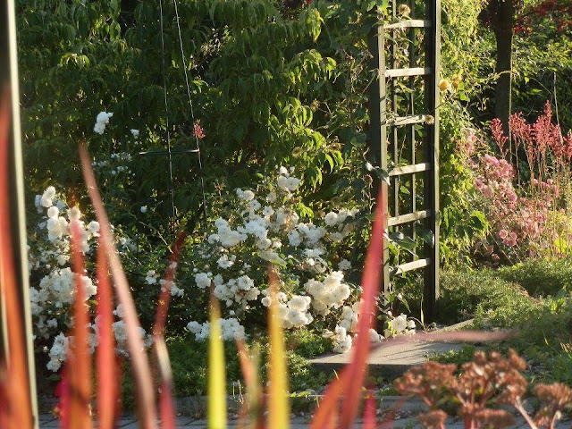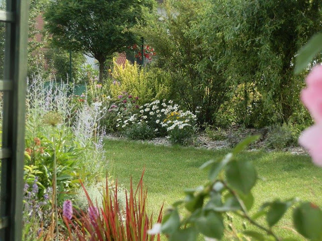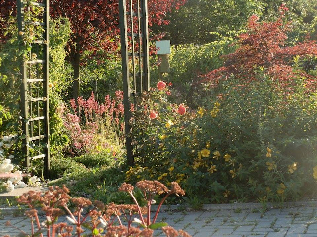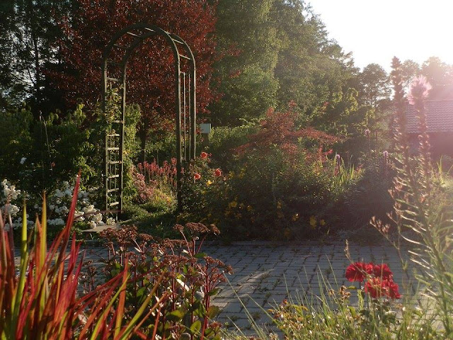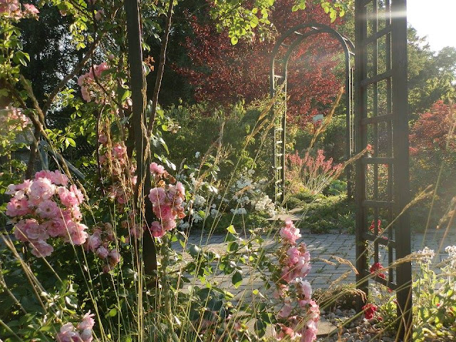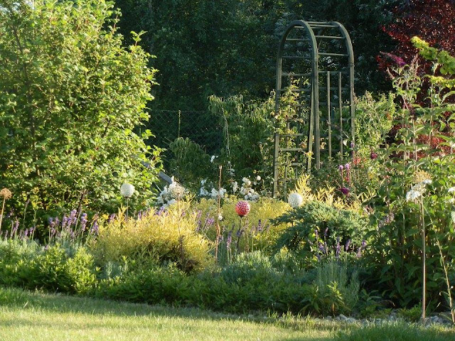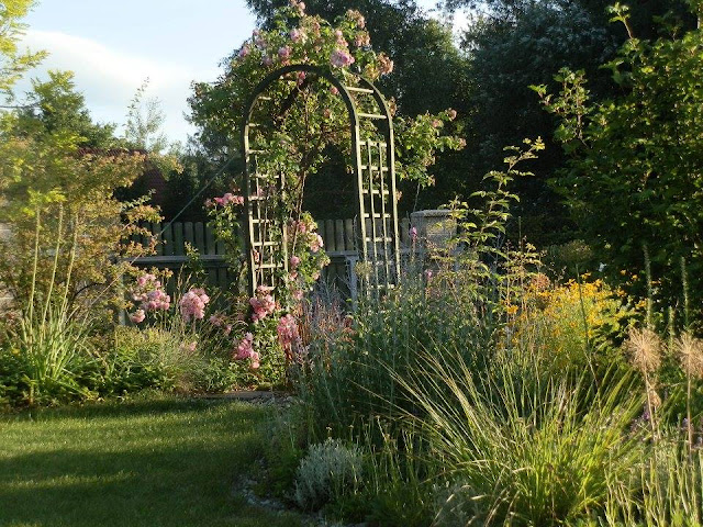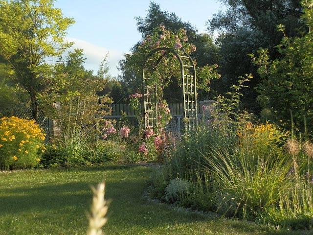 Zpátky k zahradním obloukům – pobyt u prvního, o němž tu již byla řeč, nám naskýtá pohled na další, který vyrostl na začátku záhonu za příjezdovou cestou a vyzývá ke vstupu do další části zahrady (kam jsem vás pozvala posledně). V jeho blízkosti roste keř bílých růží a za ním nádherný dřín japonský. V průhledu je vidět i krásně tmavorůžově kvetoucí dlužichy krvavé.