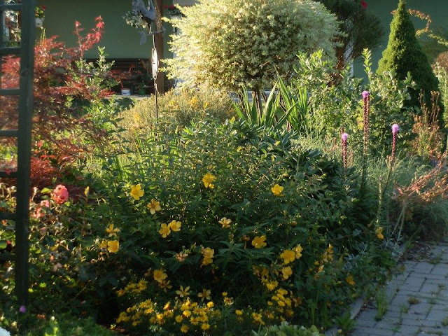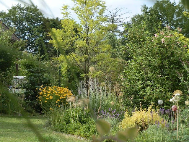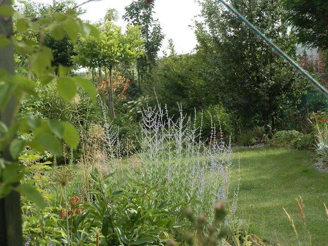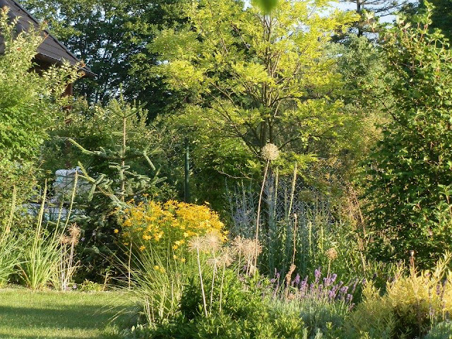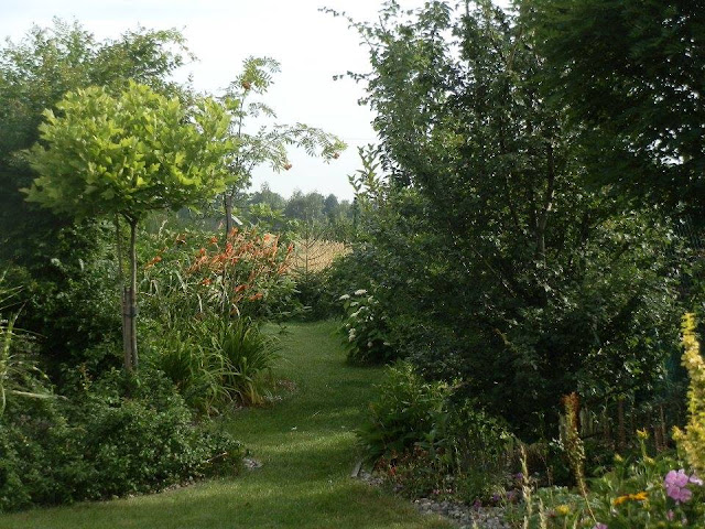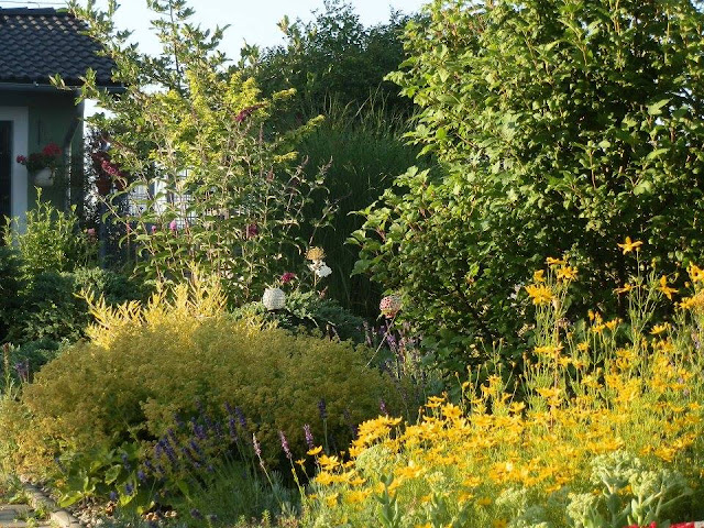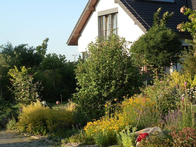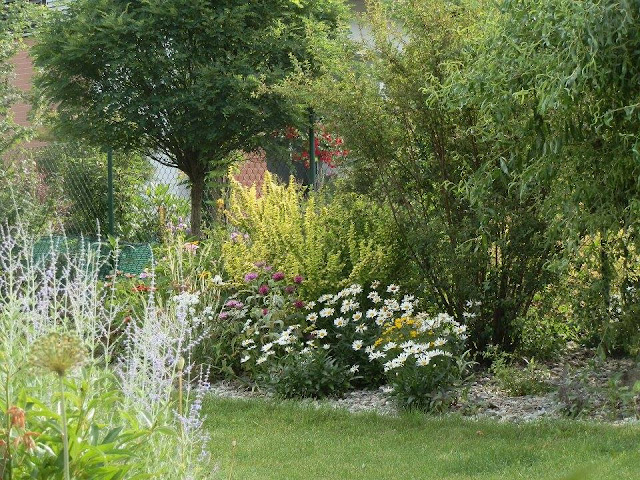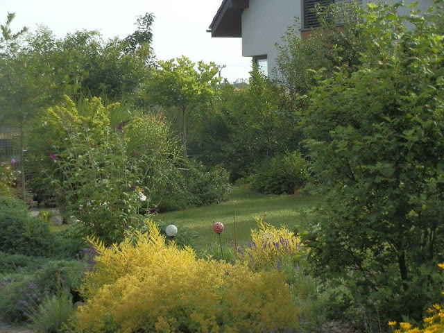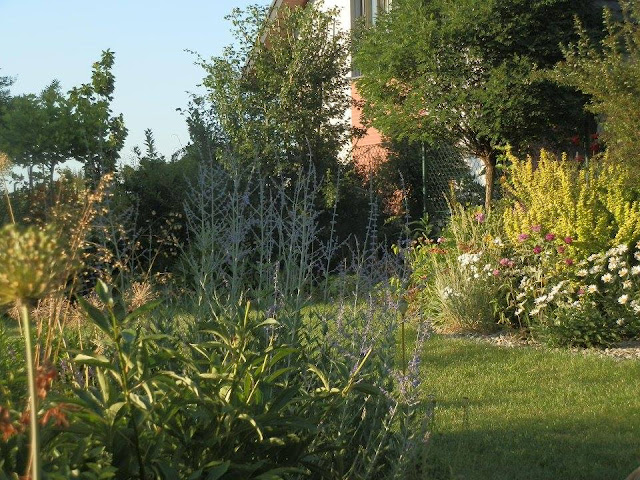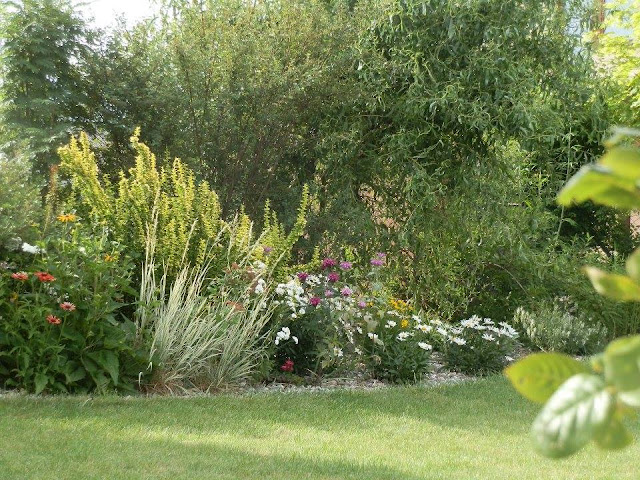 Pokud se vrátím pohledem zpátky k východní hranici pozemku, kterou lemují vyšší keře či stromy, zavadí oko o kvetoucí podrost tvořený pod vrbou pokroucenou zejména kopretinami, echinaceou, rudbeckií, řebříčkem bertrámem…