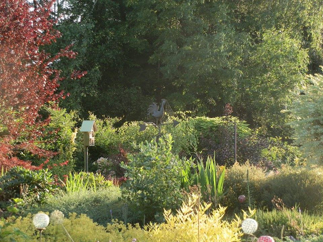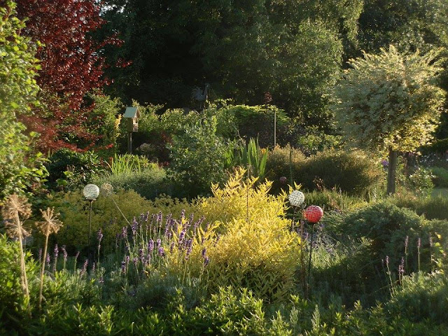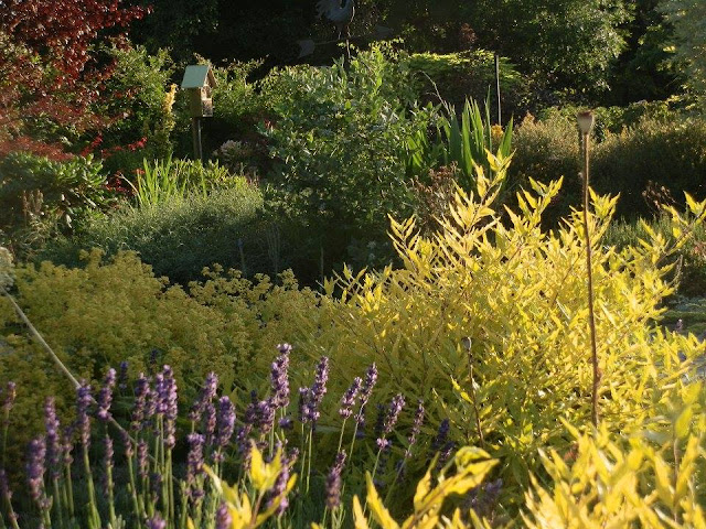 A ještě jeden bližší pohled – odhalující keře ořechoplodců klandonských („Worcester Gold“) – jejich barva hezky koresponduje s žlutozeleně kvetoucím kontryhelem měkkým („Thriller“).